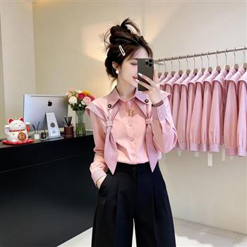 YF7407-(2色入内)甜美时尚粉色假两件长袍翻领系扣披肩设计温柔风衬衣
