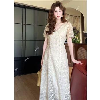 YF7411-图片色夏日度假风镂空勾花设计短袖V领修腰坠地感觉蕾丝连衣裙