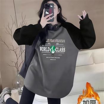 YF6680-(2色入内)德绒冬装字母印花长袖连肩二色拼接宽松大码加厚学院风潮流卫衣