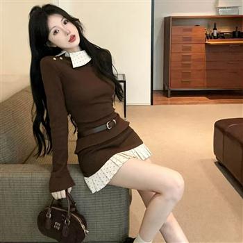YF2990-(2色入内)港味辣妹双排扣系带包臀防走光假两件小众设计感牛仔裙裤