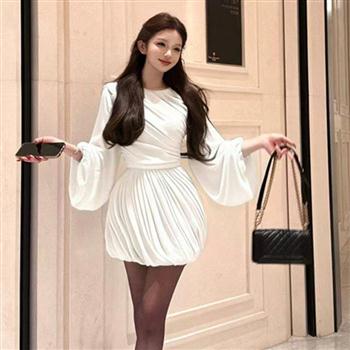 YF6687-图片色泡泡袖套头弹力修腰褶折蓬蓬花苞拼接感设计赫本风连衣裙