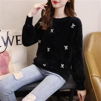 YF6685-(6色入内)韩版冬季新款点缀手工钉珠圆领长袖宽松大码水貂绒针织毛衣
