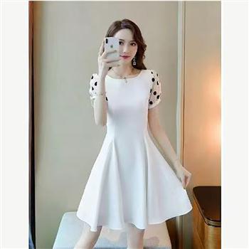 YF7151-(4色入内)赫本风夏季时尚波点拼接短袖圆领套头收腰褶折超仙新款连衣裙
