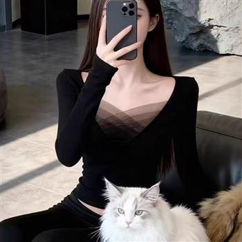 YF7158-图片色黑色时尚网纱拼接弹力修身显瘦长袖深V设计纯欲风上衣