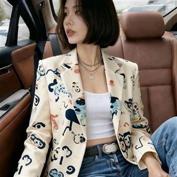YF6845-图片色休闲时尚简练个性印花慵懒风长袖翻领系扣韩版西装外套