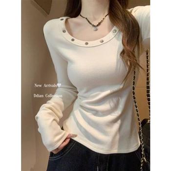 YF7083-(3色入内)韩版迷彩铆钉圆领长袖弹力修身显瘦港式春夏薄装外穿T恤