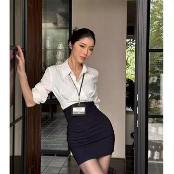 YF7084-(2色入内)高级感长袖翻领暗纹撞色设计纯欲风辣妹显瘦港式衬衫