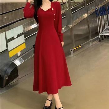 YF6702-(2色入内)时尚冬季假两件系扣弹力修身包臀赫本风设计针织连衣裙