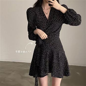 YF6706-图片色韩版小可爱迷人波点泡泡袖侧绑绳收腰小众设计赫本风连衣裙