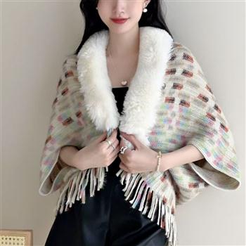 YF7100-(4色入内)冬季名媛风斑点纹毛毛围脖流苏民族风复古针织斗蓬外套