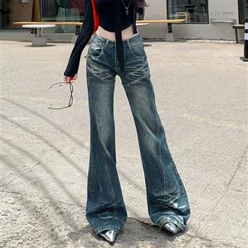 YF6162-图片色港式微喇叭低腰压褶洗水坠地感新款辣妹复古百搭牛仔裤