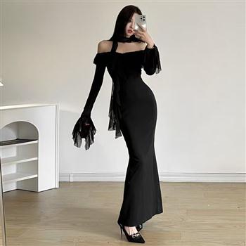 YF6165-图片色赫本风一字肩修腰包臀鱼尾设计围脖飘带中长款礼服长裙