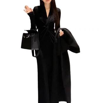 YF6166-图片色秋冬新款长袖深V扭纹修腰轻奢感显瘦黑色连衣裙