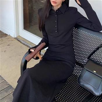 YF6167-图片色法式甜美时尚长袖POLO领排扣修腰包臀过膝别致感连衣裙