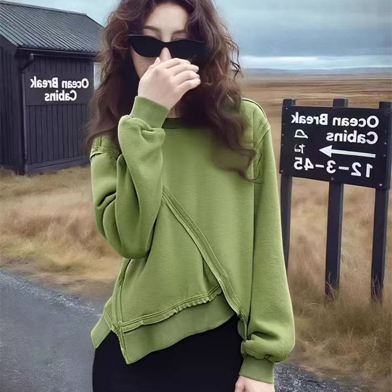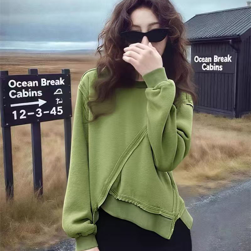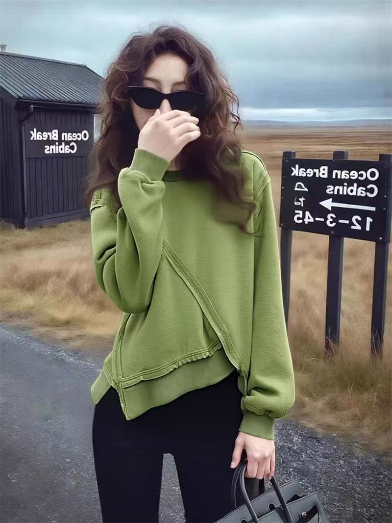 YF7051-图片色时尚春秋不菲规则拼接慵懒风圆领长袖个性设计感绿色卫衣