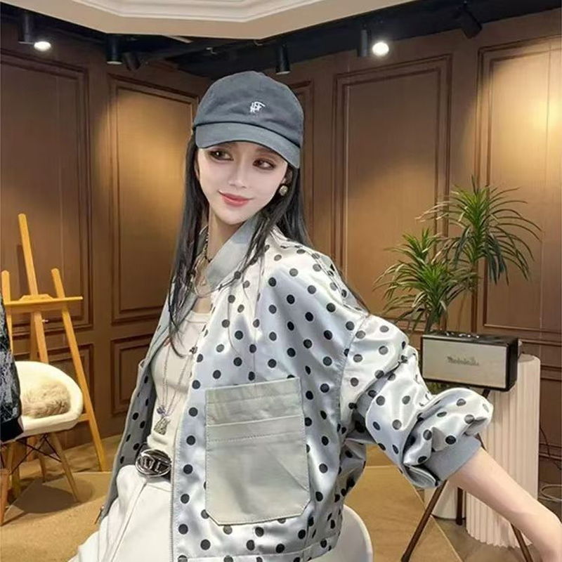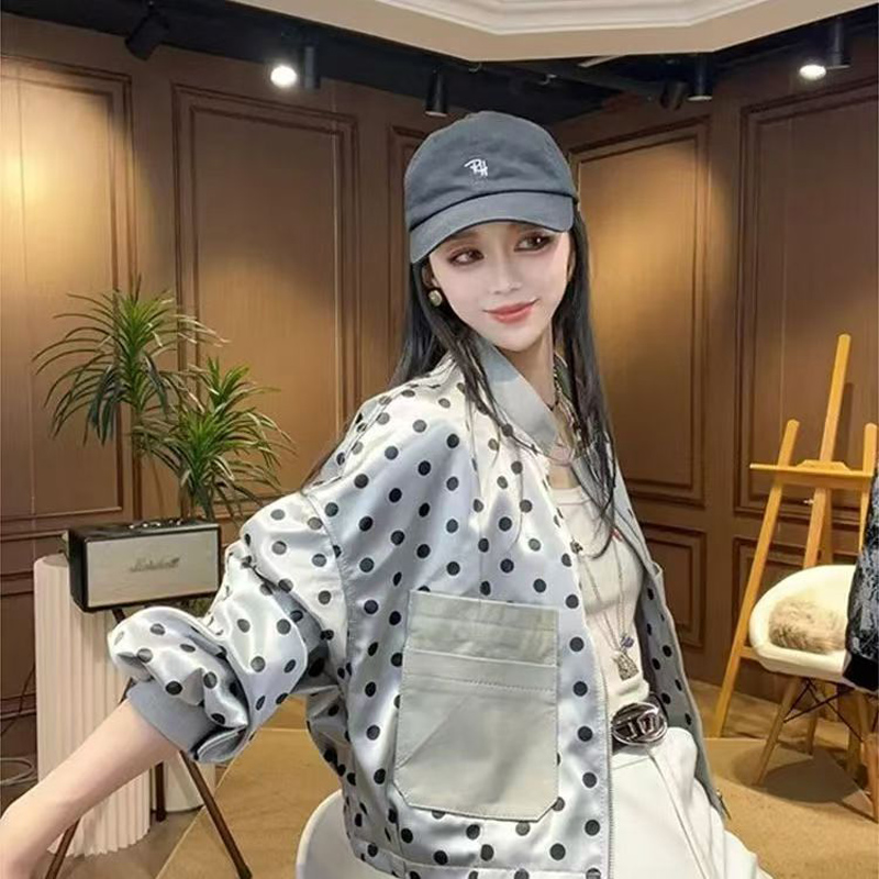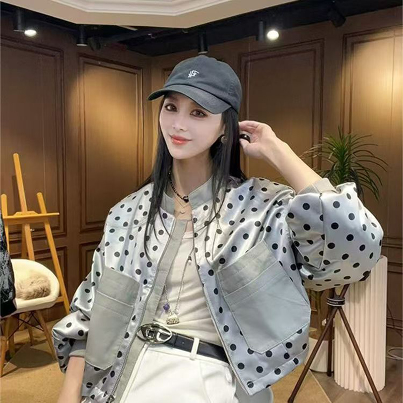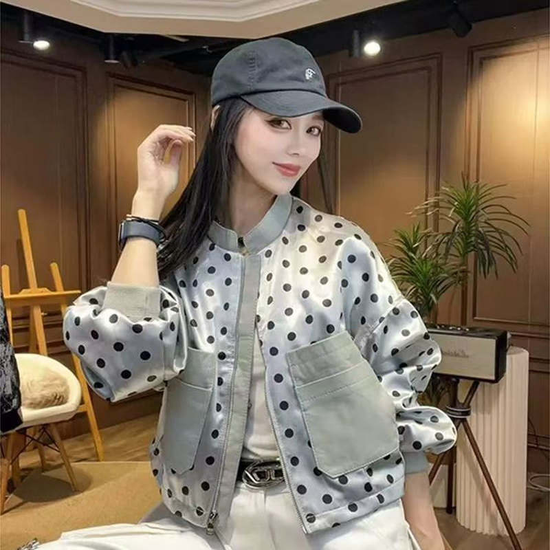 YF7052-图片色港式时尚波点泡泡袖立领大口袋宽松显瘦休闲薄装夹克外套