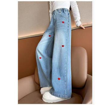 YF6858-(2色入内)时尚港式爱心刺绣设计感松紧腰直筒坠地感休闲百搭牛仔裤