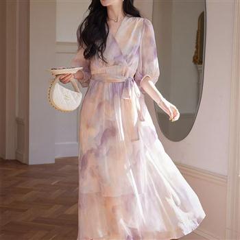 YF7403-图片色甜美时尚茶歇短袖V领系带碎花优雅气质度假风雪纺连衣裙