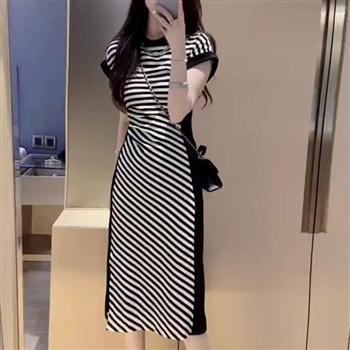 YF7430-图片色夏季名媛气质圆领修腰撞色开叉设计条纹显瘦休闲风连衣裙