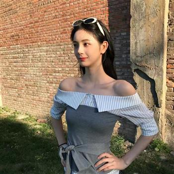YF6084-(2色入内)时尚春秋不规则小众设计侧绑绳条纹露肩长袖大码上衣