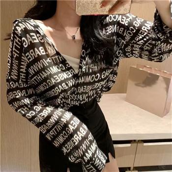 YF5582-(2色入内)字母印花洋气长袖POLO领宽松显瘦薄款透视雪纺上衣