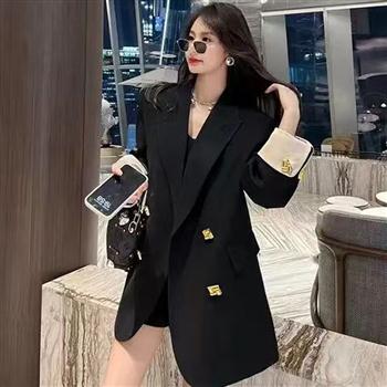YF5989-图片色春秋休闲时尚长袖修腰排扣中长款大码简约百搭西装外套