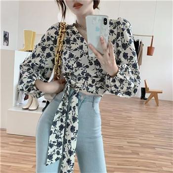 YF7159-图片色时尚新款长袖V领绑带束腰短装碎花复古风韩版上衣