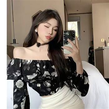 YF7222-图片色性感时尚一字肩荷叶边碎花露脐短装别致设计雪纺上衣