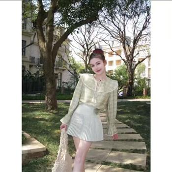 YF7225--图片色学院风复古格子夏天短袖POLO领修身显瘦chic气质上衣