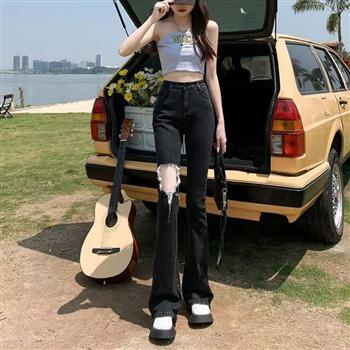 YF7240-(2色入内)韩版夏季新款高腰破洞微喇叭设计感坠地感休闲百搭牛仔裤