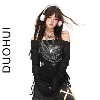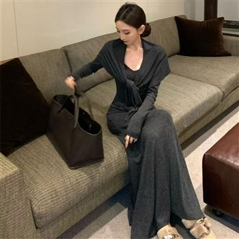 YF6410-(2色入内)秋冬辣妹小众不规则修身侧绑带上衣搭直筒坠地感德绒两件套装