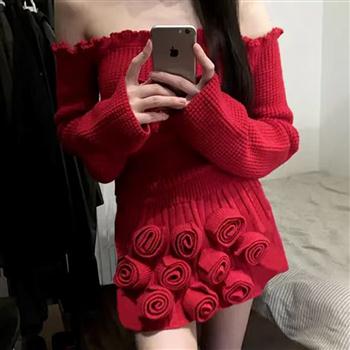 YF6232-(3色入内)冬装钉珠纯欲风性感露肩蝙蝠袖弹力包臀显瘦大码针织连衣裙