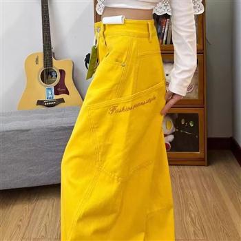 YF6209-(2色入内)字母刺绣弯刀拼接系扣高腰阔腿慵懒风复古蓝休闲牛仔裤
