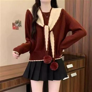 YF6208-(3色入内)海军风撞色翻领绑带毛毛球设计长袖大码针织上衣