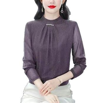 YF6218-(3色入内)名媛气质闪闪亮钉珠褶折透视袖圆领宽松别致蕾丝新款