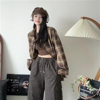 YF6221-(2色入内)港味春秋百搭复古格子长袖翻领宽松显瘦大码磨毛衬衣