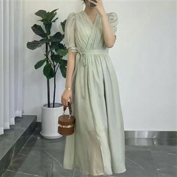 YF7164-(2色入内)夏季优雅雪纺连衣裙 短袖V领绑绳束腰法式夏季裙子