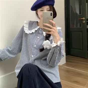 YF7168-图片色娃娃领蕾丝边撞色设计小心机复古格子大码韩版夏季上衣