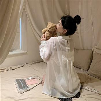 YF7285-(2色入内)后背镂空蝴蝶结设计慵懒风长袖蝉衣薄款防蚊防晒雪纺衫