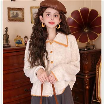 YF6968-(2色入内)甜美法式长袖翻领排扣磨毛围边撞色小众设计宽松针织上衣