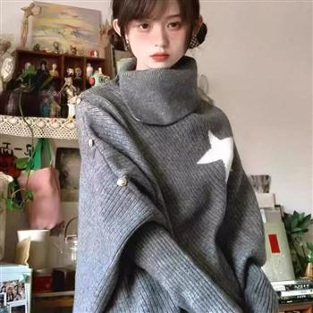 YF6967-图片色时尚冬装不规则星星长袖高领宽松开叉显瘦蝙蝠袖针织毛衣