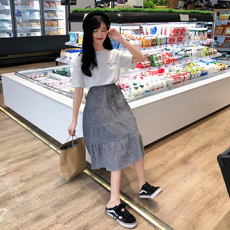 Y2065-(2色入内)港味新款松紧腰格仔宽松大摆拼接民族风半身裙 中长裙