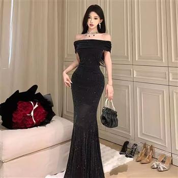 YF7495--图片色名媛气质一字肩弹力修腰包臀鱼尾闪闪亮拖地鱼尾礼服连衣裙