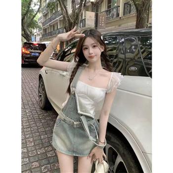 YF7497-图片色原宿风时尚吊带系腰带辣妹性感复古蓝A字包臀牛仔裙
