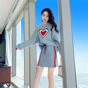 YF7499-图片色学院风圆领套头爱心印花宽松大码上衣松紧腰系绳A字裙港式套装