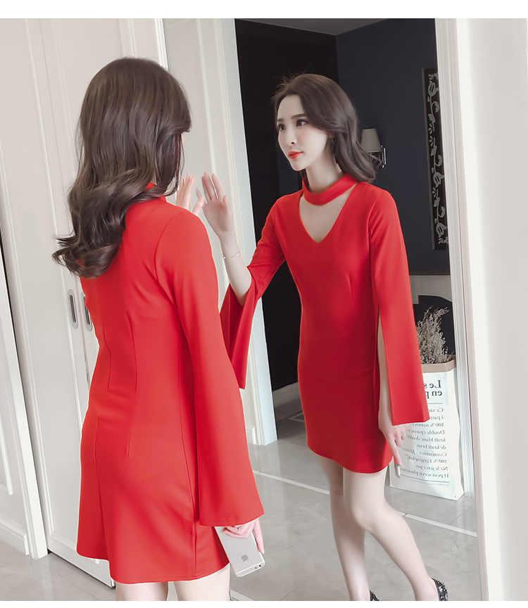 Y5915-(3色入内)小可人时髦新款开叉长袖围脖镂空收腰包臀OL纯色连衣裙
