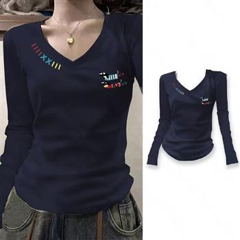 YF6114-(4色入内)别致新款小可爱狗狗字母印V领长袖小清新简约显瘦T恤