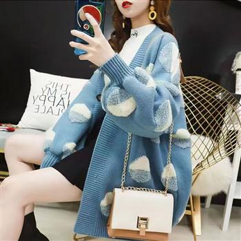 YF6113-(4色入内)慵懒风撞色绒球个性设计长袖开衫加厚大码冬装针织毛衣外套