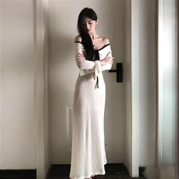 YF6115-图片色冷艳气质一字肩撞色抹胸修腰包臀过膝长款秋冬显瘦连衣裙