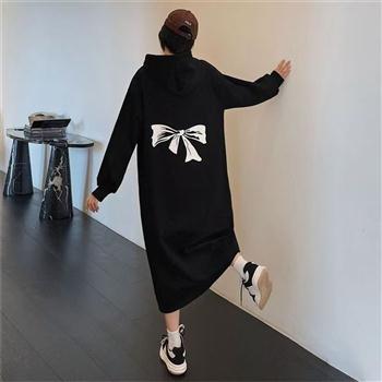 YF6116-图片色秋冬简约字母印花长袖连帽宽松藏肉显瘦保暖卫衣长裙